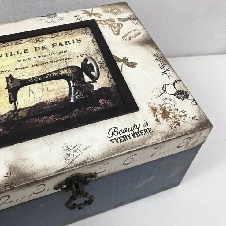 Somente o desenho da máquina de costura é uma decoupage, o restante da caixa é pintura.